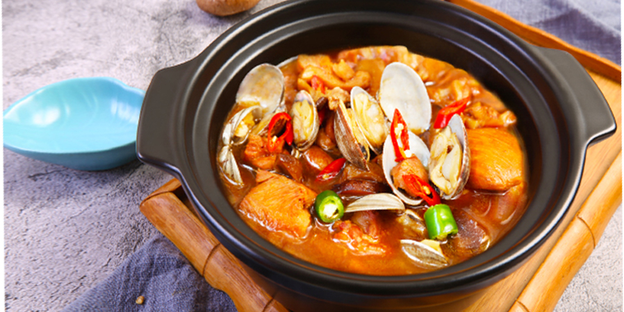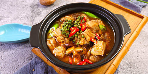 經(jīng)過數(shù)十種香料和名貴藥材的秘制醬料精心烹飪而成,用土制燒制而成,雞塊在砂鍋內(nèi)沸騰...